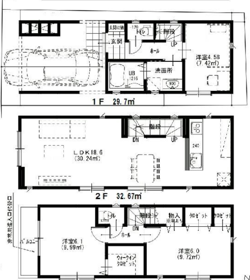 | 専有面積または建物面積 | 95.04㎡(1階29.7㎡・2階32.67㎡・3階32.67㎡.車庫12.28㎡) | 土地面積 | 50.44㎡ |